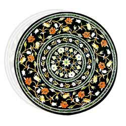 Table tops in marble or Cudappa black stone with detailed inlay work with colored stones and semiprecious gemstones define the richness of design and the artwork. We possess a collection of these in different shapes and styles.